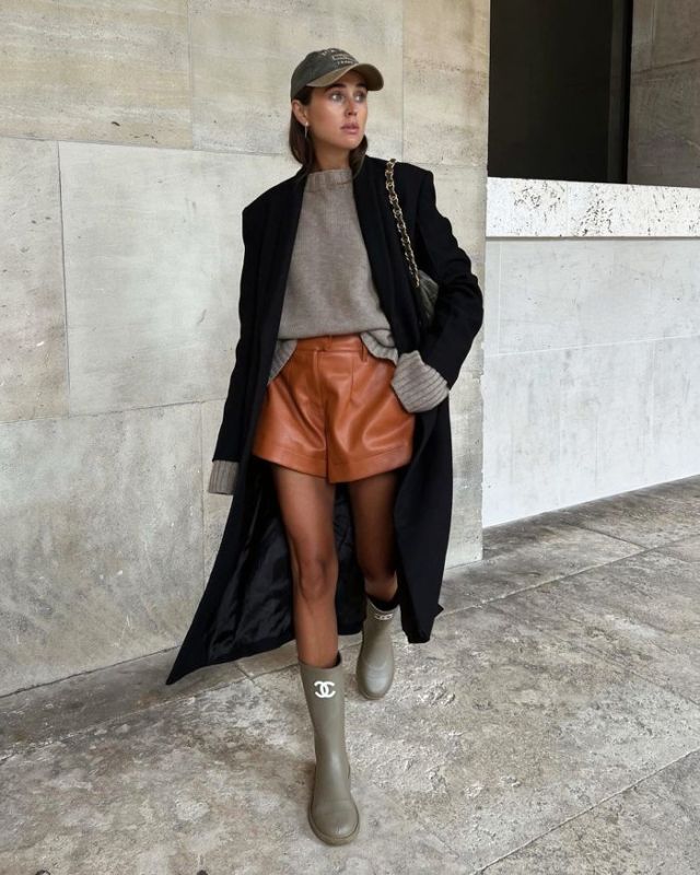 Whilst neutrals are always appropriate at this time of year, winter outfits don’t have to be all black and grey. Inject some colour into your wardrobe with leather shorts in hues like deep burgundy, forest green, or burnt orange. Pair them with a neutral turtleneck sweater—think cream or beige—to let the shorts stand out.